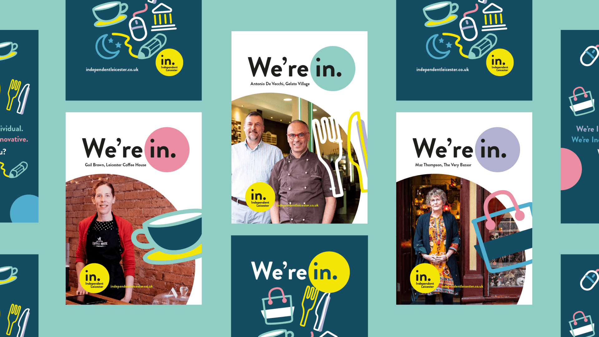 The We’re In messaging has been paired up with the roundel design from the brand to create a badge. The Independent Leicester badge will become a mark of quality for companies in the city. It’s a unifying marker that tells passers-by “We’re in, and we care about independent business in Leicester.”