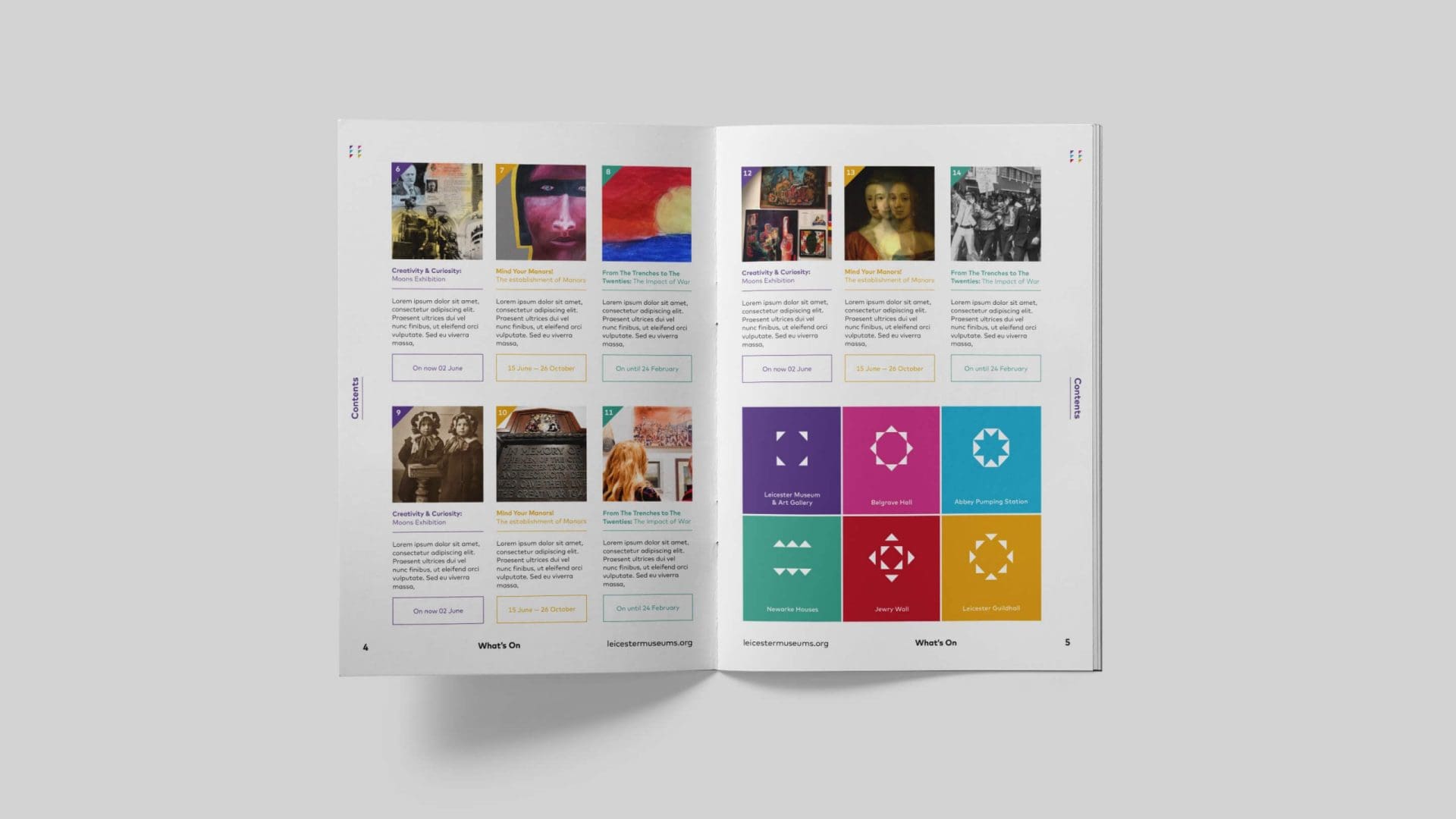 For each of the six museums we’ve highlighted elements from each venue through the use of the mosaic format, clearly giving each their own identity, whilst ensuring they all look and feel like part of the same family. The umbrella identity has taken the base colour from each of the six logos and combined them in one unified design.