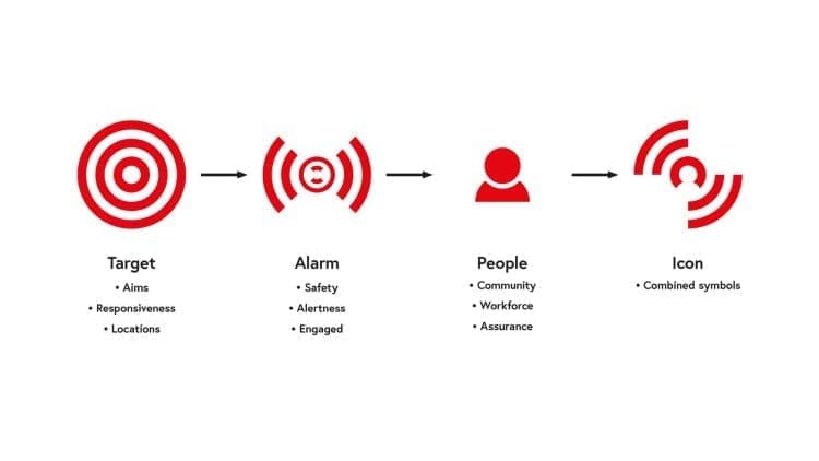 The identity we created for ‘Safer People, Safer Places is based around three combined visual elements – Targets, People and Alarm symbols. These three images are neatly broken down further into subsets of meaning, which you can see below. All of this work is encapsulated in the icon, which sits alongside the Leicestershire Fire and Rescue Service logo.